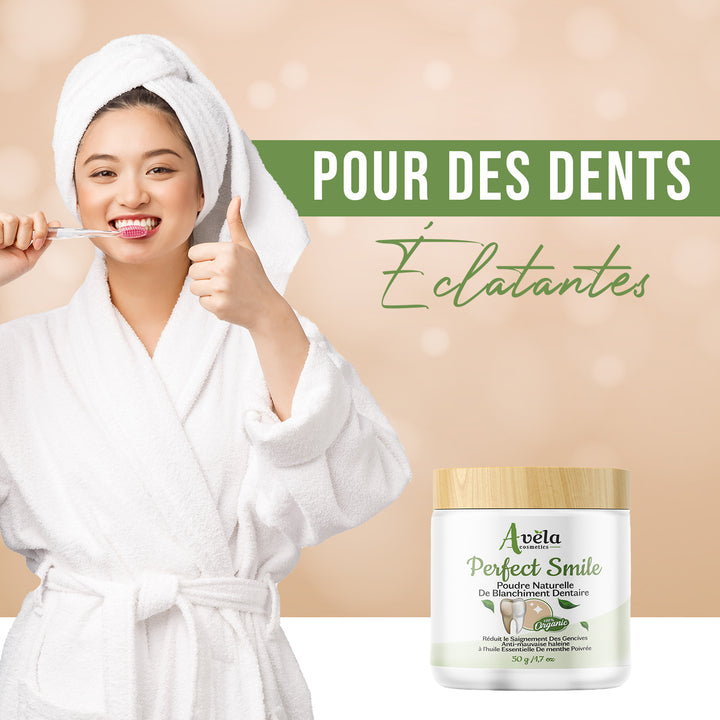 La poudre de blanchiment dentaire perfect smile à la formule 100% naturelle, elle aide à réduire les taches et blanchir les dents, pour une haleine fraîche et un sourire éclatant.
